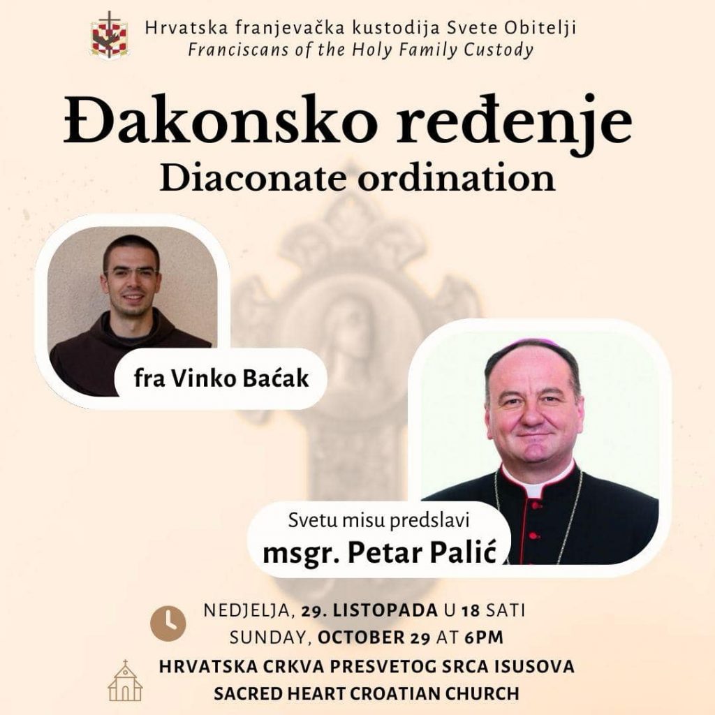 Chicago, (IKA) – Bogoslov Hrvatske franjevačke kustodije Svete Obitelji fra Vinko Baćak bit će zaređen za đakona u nedjelju, 29. listopada po rukama mostarsko-duvanjskog biskupa Petra Palića. Misa u hrvatskoj župi Srca Isusova počinje u 18 sati (6:00 PM) po lokalnom vremenu.