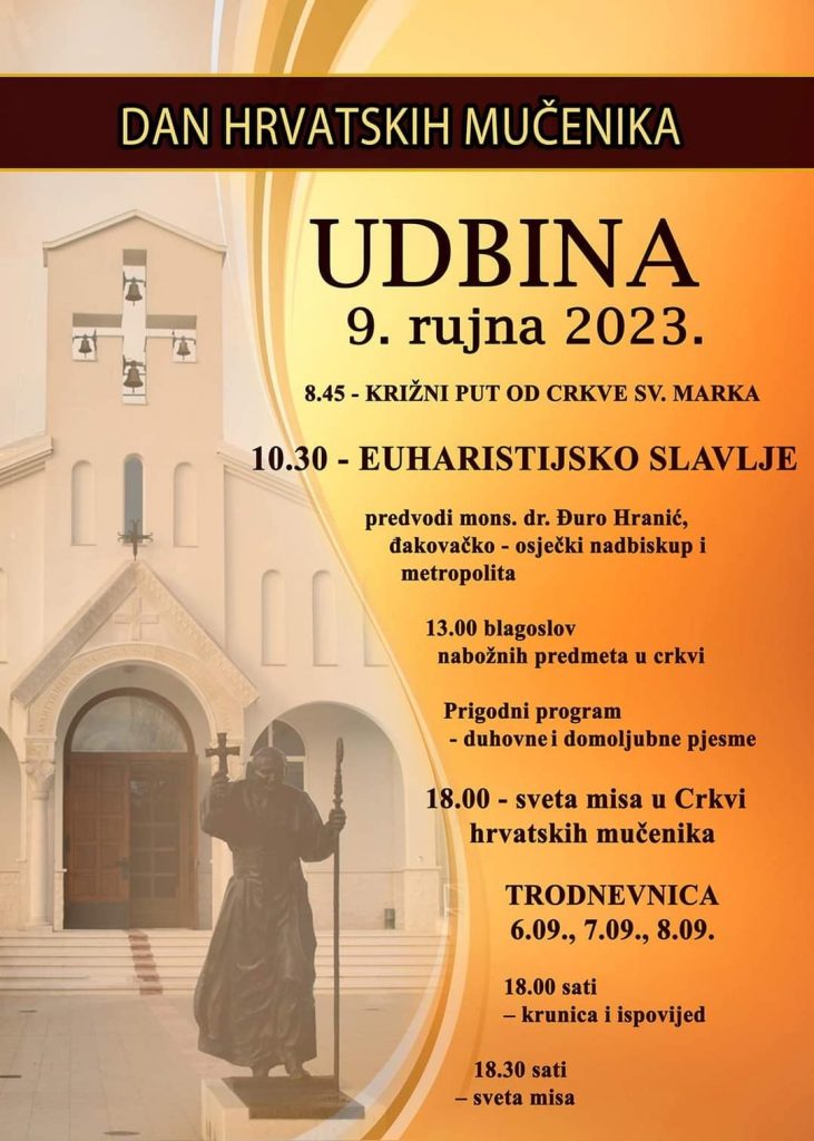 Udbina, (IKA) – Proslava Dana hrvatskih mučenika na Udbini bit će u subotu 9. rujna. Središnje euharistijsko slavlje u 10.30 sati predvodit će đakovačko-osječki nadbiskup i metropolit Đuro Hranić.