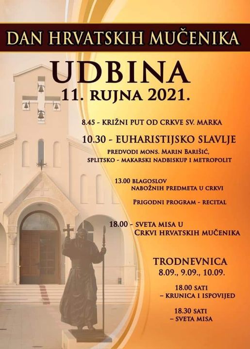 Udbina, (IKA) – Dan hrvatskih mučenika bit će proslavljen u subotu 11. rujna na Udbini. Svečano euharistijsko slavlje u 10.30 sati predvodit će splitsko-makarski nadbiskup i metropolit Marin Barišić. Popodnevna misa bit će u 18 sati.