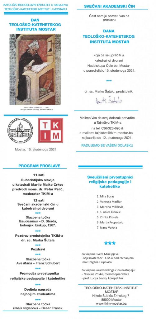 Mostar, (IKA) – Dan Teološko-katehetskog instituta u Mostaru bit će proslavljen u ponedjeljak 15. studenoga, najavljeno je na portalu Crkva na kamenu.
