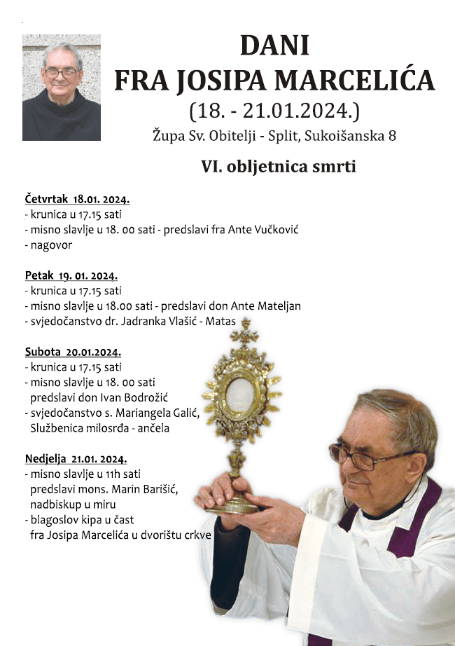 Župa Svete obitelji na splitskom Sukoišanu organizira Dane fra Josipa Marčelića, u povodu 6. godišnjice njegove smrti, od četvrtka 18. do nedjelje 21. siječnja 2024.