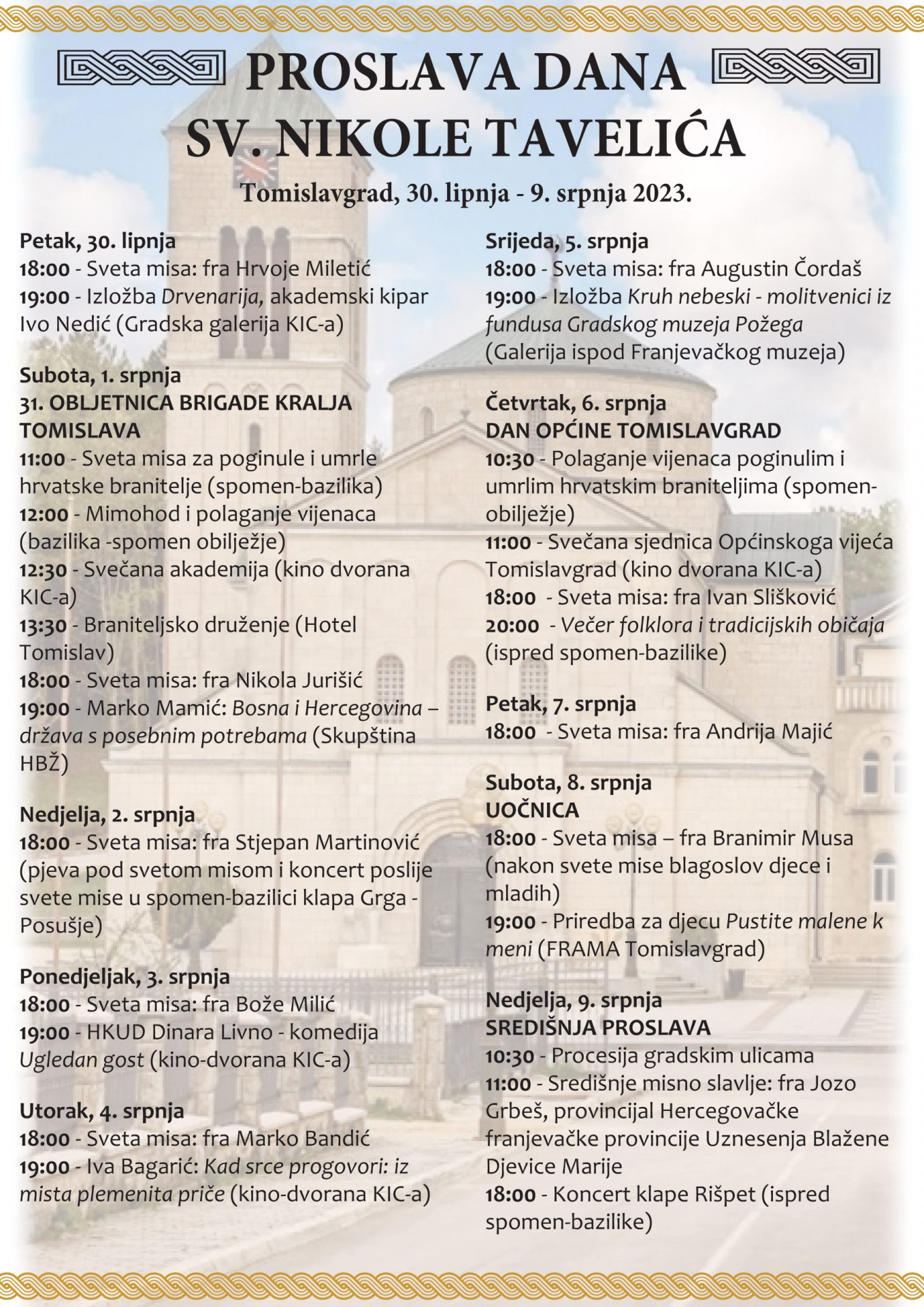 U Tomislavgradu se od 30. lipnja do 9. srpnja održava duhovno-kulturna manifestacija Dani sv. Nikole Tavelića 2023.”, koju zajednički organiziraju Općina Tomislavgrad, Franjevački samostan, Radio Tomislavgrad i Kulturno-informativni centar Tomislavgrad.
