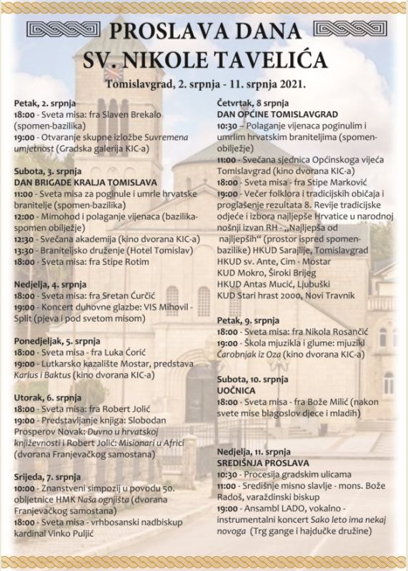 TOMISLAVGRAD (IKA) – Od 2. do 11. srpnja u Tomislavgradu se održava duhovno-kulturna manifestacija „Dani sv. Nikole Tavelića 2021.“, koju zajednički organiziraju Općina Tomislavgrad, Franjevački samostan i Kulturno-informativni centar Tomislavgrad.