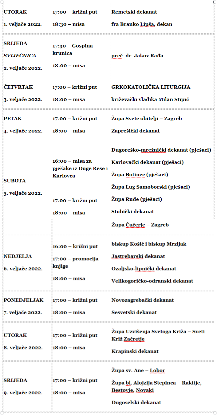 • u srijedu, 9. veljače, misu od 18 do 19 sati