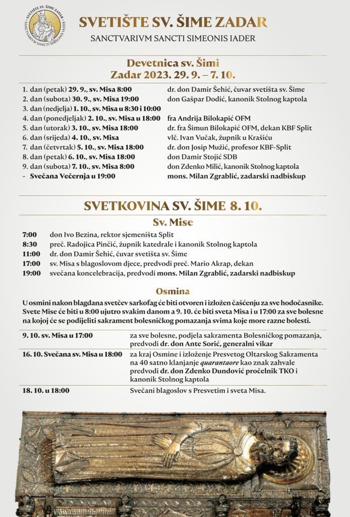 Ususret proslavi blagdana sv. Šime, zaštitnika grada Zadra čijem se zagovoru utječe puk iz cijele Zadarske nadbiskupije, u svetištu sv. Šime u Zadru održava se devetnica od petka 29. rujna do subote 7. listopada.