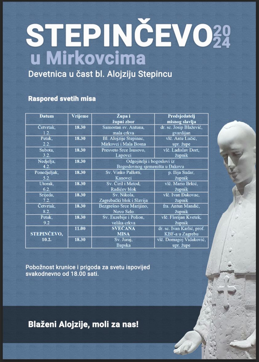 Devetnica bl. Alojziju Stepincu u istoimenoj župi u Mirkovcima počinje 1. veljače. Večernja misna slavlja započinju u 18.30, a pola sata prije mise prilika je za osobnu pobožnost i ispovijed. Župa treću godinu zaredom organizira devetnicu. Ove godine devetnicu će predvoditi župe grada Vinkovaca te zajednica Bogoslovnog sjemeništa iz Đakova.