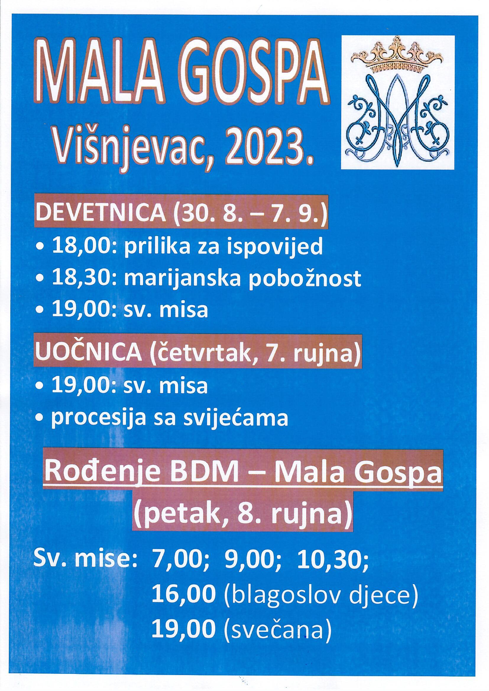 U župi Rođenja Blažene Djevice Marije u Višnjevcu u srijedu, 30. kolovoza 2023. započinje devetnica Maloj Gospi, koja završava u četvrtak, 7. rujna. Svakoga dana devetnice bit će prilika za ispovijed od 18 sati.