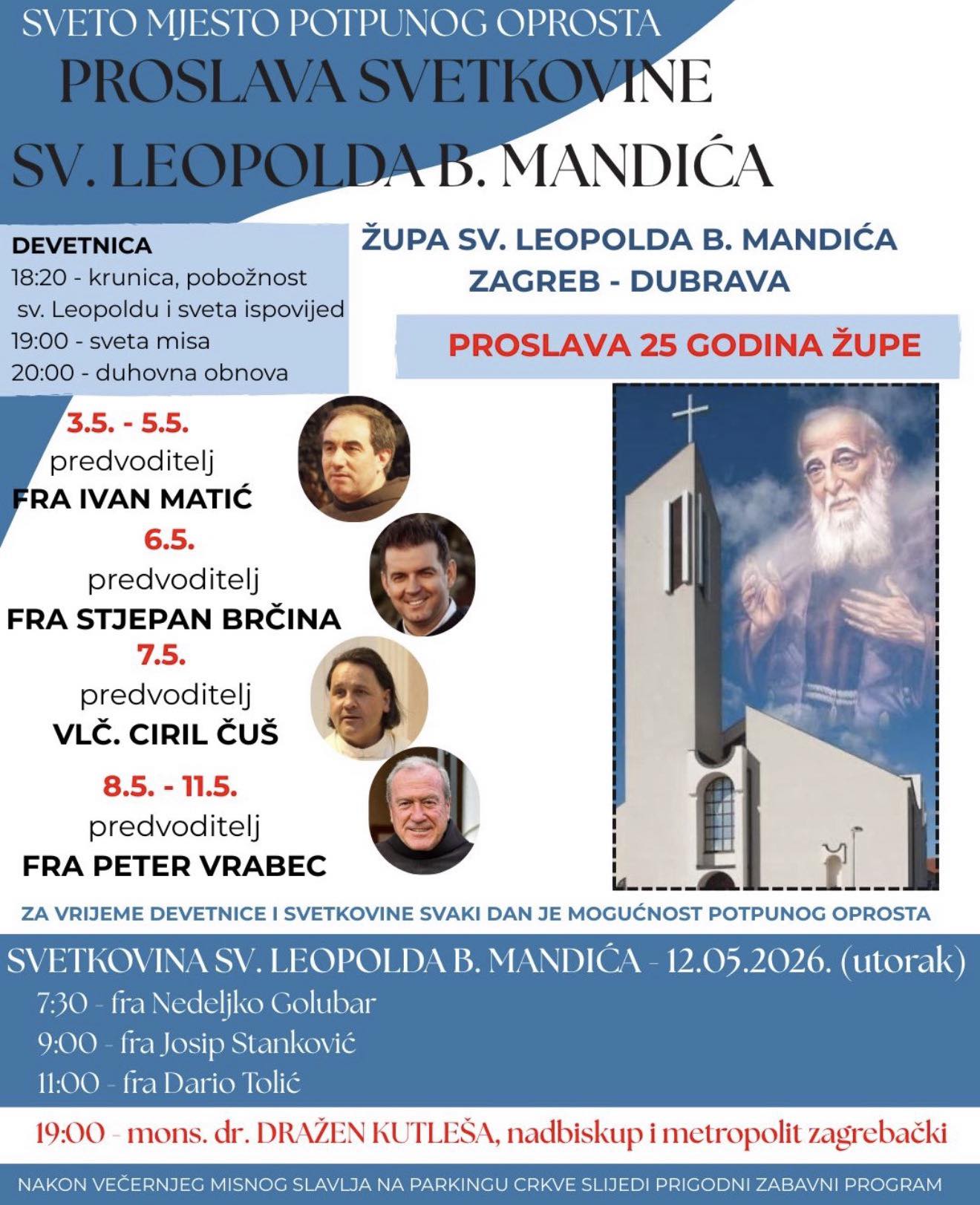 Program devetnice počet će u 18:20 molitvom krunice i pobožnosti sv. Leopoldu, u 19 slavit će se misa, a u 20 je predviđena duhovna obnova.