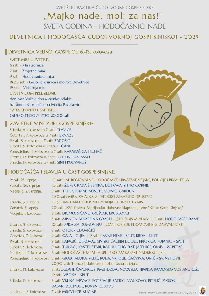 Devetnica Velikoj Gospi u svetištu Čudotvorne Gospe Sinjske bit će od 6. do 13. kolovoza. Misa zornica bit će u 6 sati, zavjetna misa u 7 sati, hodočasnička misa u 9 sati, Gospina krunica i molitva devetnice u 18.20 te večernja misa u 19 sati.