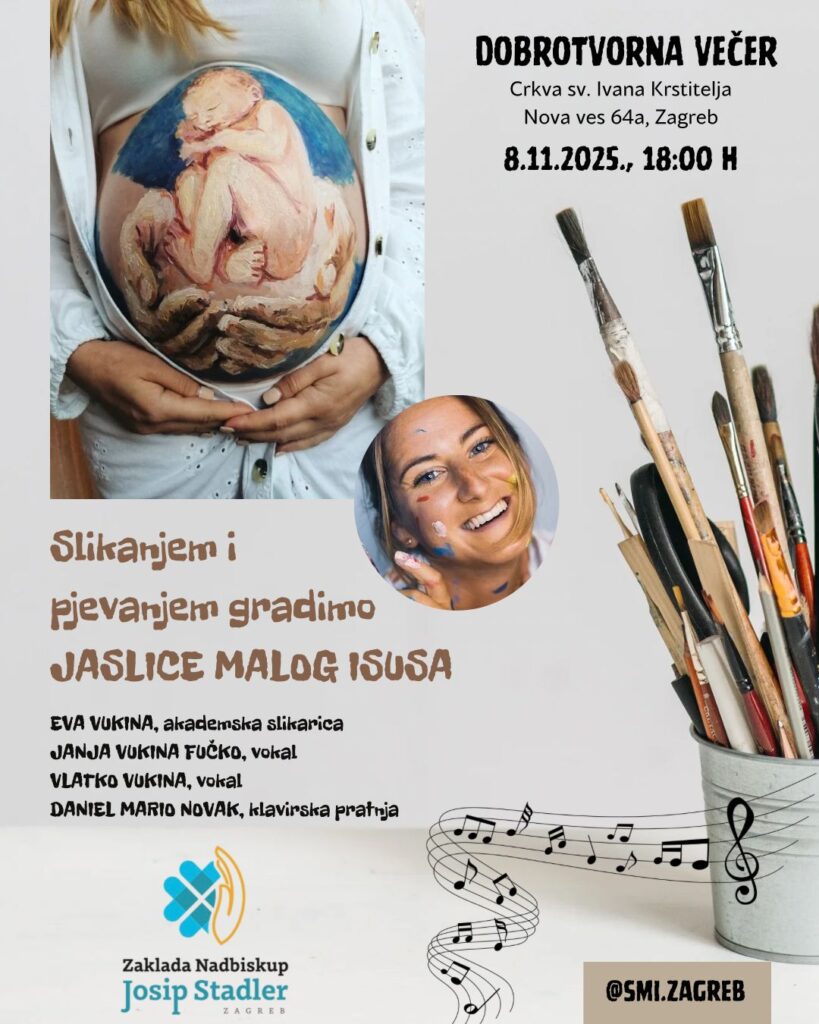 Dobrotvorna večer – koncert za Zakladu „Nadbiskup Josip Stadler“ pod nazivom „Slikanjem i pjevanjem gradimo Jaslice Malog Isusa“ sa slikaricom Evom Vukinom održat će se u subotu, 8. studenoga, s početkom u 18 sati u župnoj crkvi sv. Ivana Krstitelja (Nova Ves 64a, Zagreb).