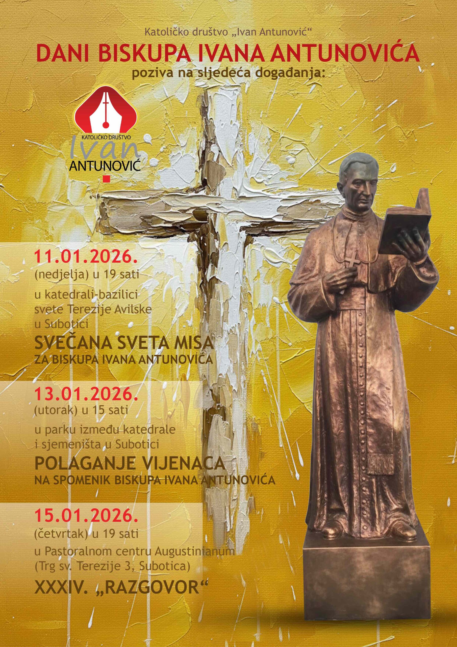 Polaganje vijenaca na spomenik biskupa Ivana Antunovića u parku između katedrale i sjemeništa u Subotici bit će 13. siječnja (utorak) u 15 sati, a XXXIV. Razgovor u Pastoralnom centru „Augustinianum“ (Trg sv. Terezije 3, Subotica) 15. siječnja (četvrtak) u 19 sati.