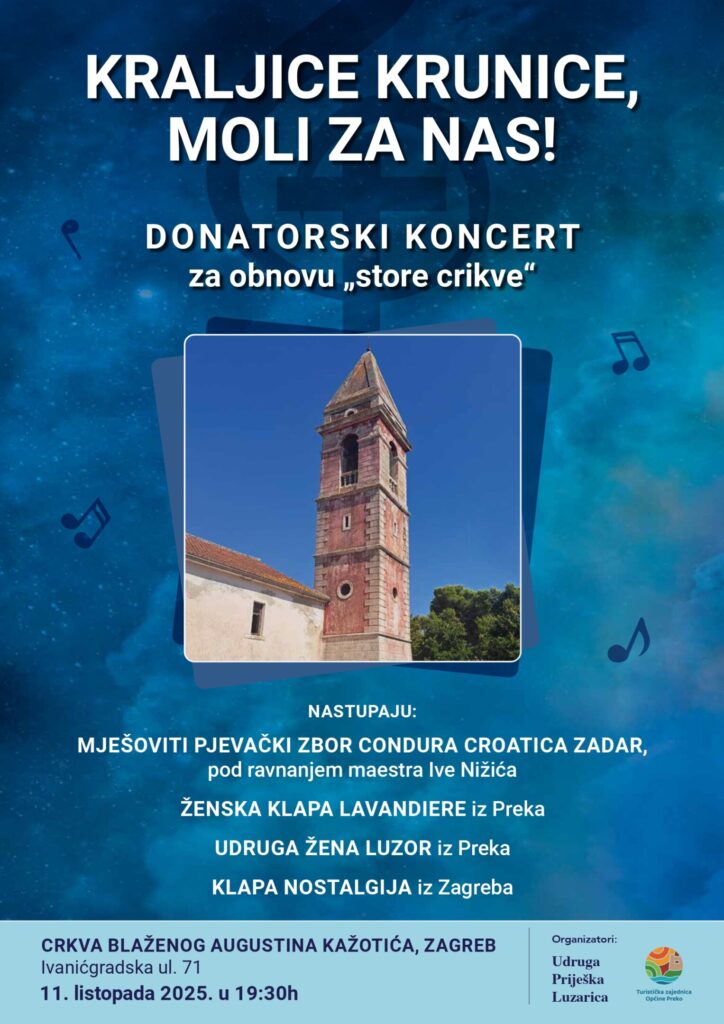 Donatorski koncert „Kraljice Krunice, moli za nas“ održat će se u subotu 11. listopada u 19:30, nakon večernje mise u crkvi bl. Augustina Kažotića na zagrebačkoj Peščenici na adresi Ivanićgradska 71.