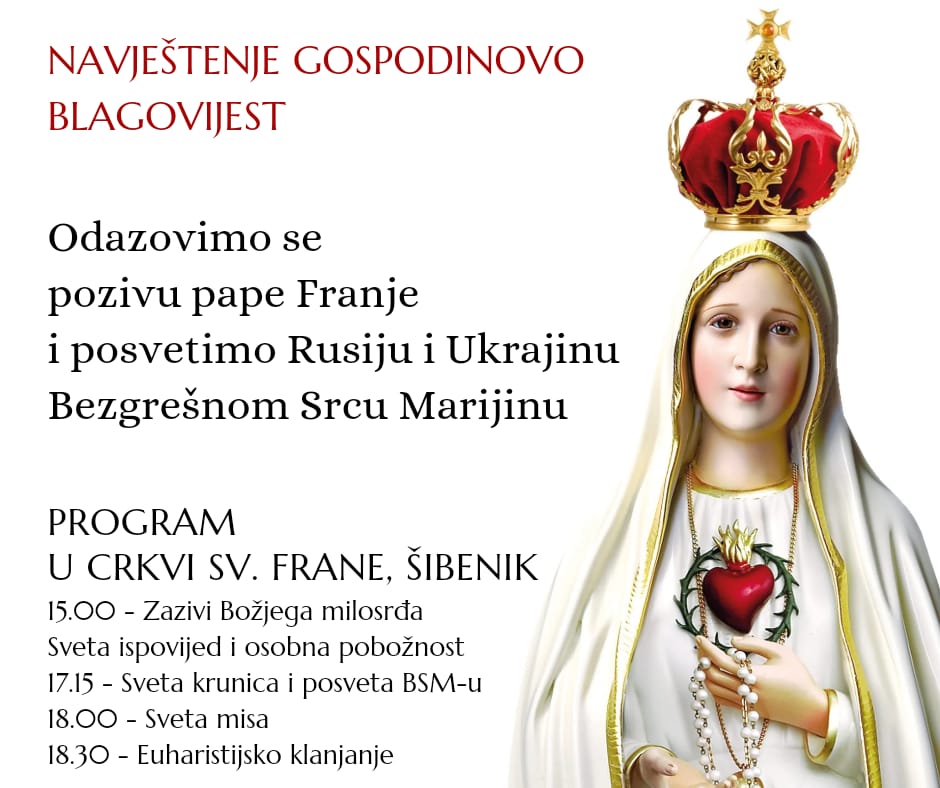 Kako se u petak 25. ožujka slavi svetkovina Navještenja Gospodinova (Blagovijest) te će toga dana papa Franjo posvetiti čovječanstvo, a posebice Rusiju i Ukrajinu Bezgrješnomu Srcu Marijinu, tom činu će se pridružiti i braća franjevci.