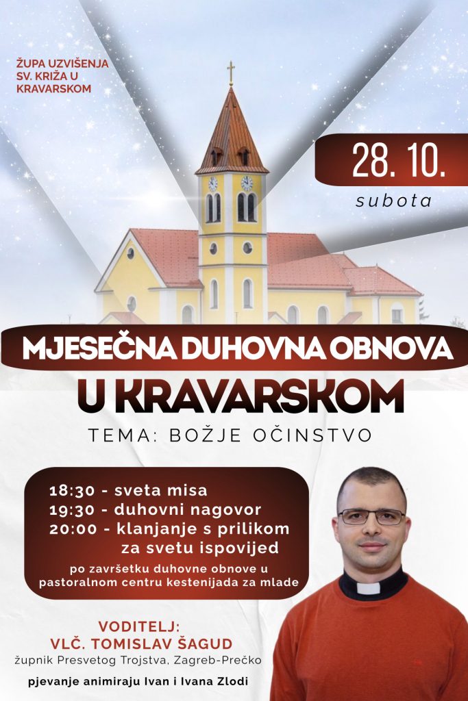Mjesečna duhovna obnova naslovljena „Božje očinstvo“ održat će se u subotu, 28. listopada 2023. u Župi Uzvišenja Svetoga Križa u Kravarskom.