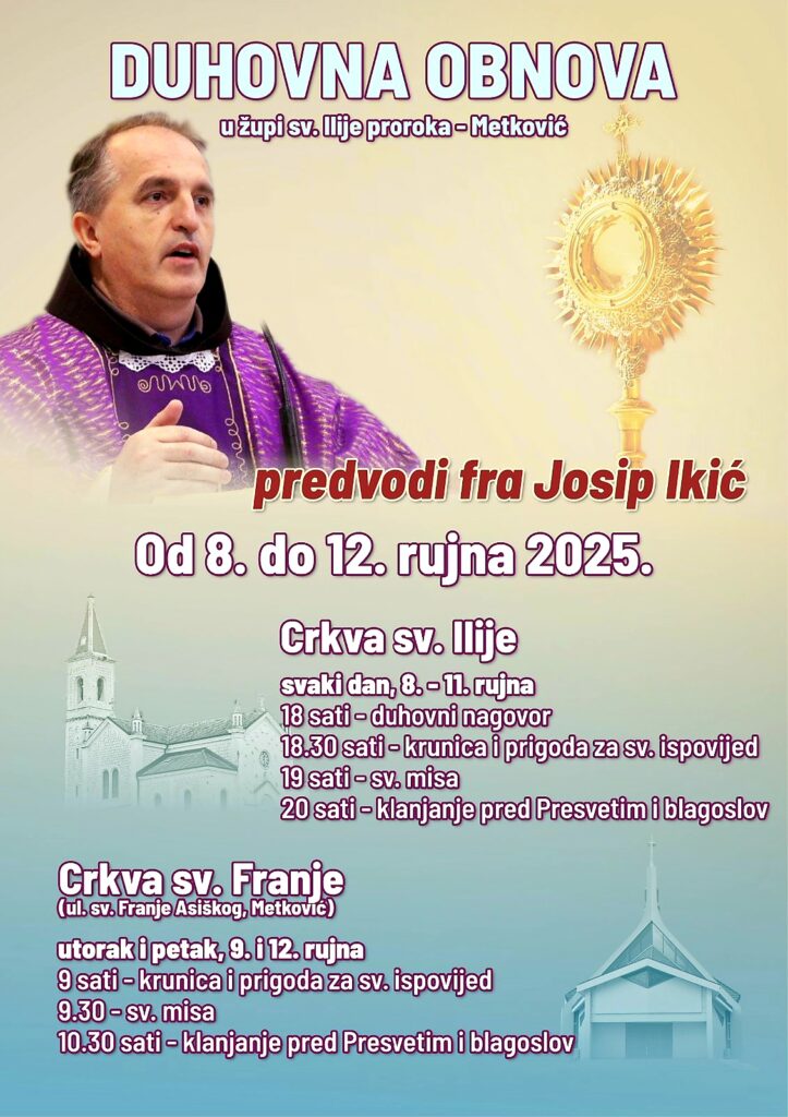 Duhovna obnova u Župi sv. Ilije proroka u Metkoviću održat će se od ponedjeljka, 8. rujna do petka, 12. rujna, a predvodit će je fra Josip Ikić. Svake večeri program započinje u 18 sati nagovorom, zatim slijedi molitva krunice, sveta misa u 19 sati te klanjanje Presvetom Oltarskom Sakramentu u 20 sati.