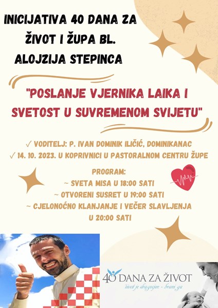 Duhovna obnova pod nazivom „Poslanje vjernika laika i svetost u suvremenom svijetu“ održat će se u subotu 14. listopada u pastoralnom centru Župe bl. Alojzija Stepinca u Koprivnici. Program započinje misom u 18 sati, nakon koje slijedi otvoreni susret. Cjelonoćno klanjanje i večer slavljenje od 20 sati predvodi fr. Ivan Dominik Iličić.