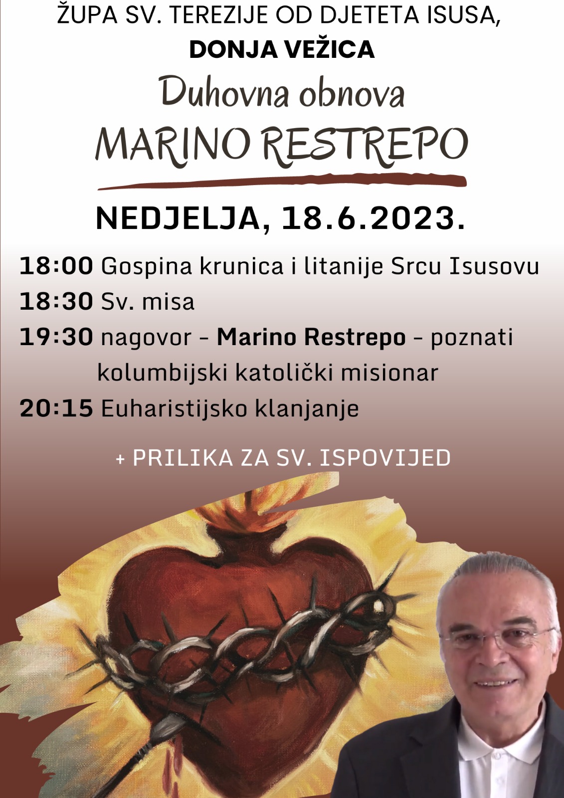 Župa sv. Terezije od Djeteta Isusa u nedjelju 18. lipnja organizira duhovnu obnovu za sve zainteresirane vjernike. U 18 sati je molitva krunice i litanije Srcu Isusovu. Misa će se slaviti u 18:30, nakon koje će u 19:30 nagovor dati kolumbijski misionar Marino Restrepo. Duhovna obnova završava euharistijskim klanjanjem u 21:15. Tijekom duhovne obnove vjernici mogu pristupiti sakramentu ispovijedi.