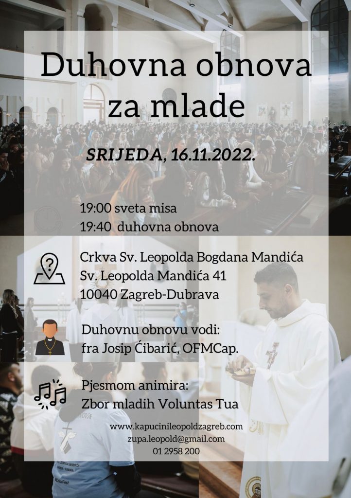Zagreb, (IKA) – Duhovne obnove za mlade održavaju se svakog mjeseca u crkvi Sv. Leopolda Bogdana Mandića u Dubravi. Iduća će biti održana u srijedu 16. studenoga u 19 sati.