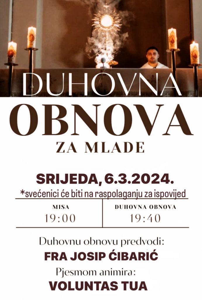 Zagreb, (IKA) – Druga ovogodišnja duhovna obnova za mlade u crkvi sv. Leopolda Bogdana Mandića u zagrebačkoj Dubravi održat će se u srijedu 6. ožujka. Počinje u 19 sati svečanim euharistijskim slavljem. Duhovnu obnovu predvodi fra Josip Ćibarić, OFMCap, a pjesmom animira zbor Voluntas Tua.