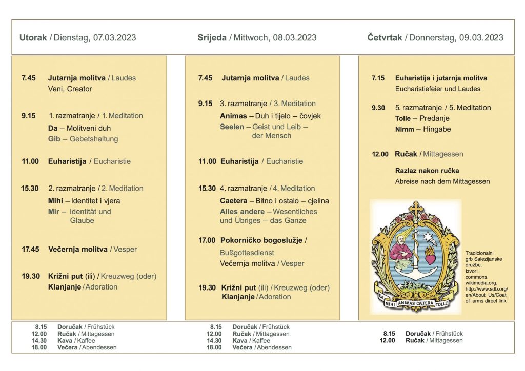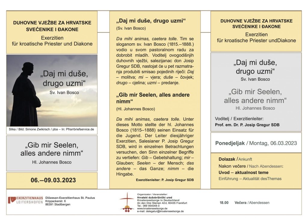 U Leitershofenu pokraj Augsburga u Njemačkoj od 6. do 9. ožujka 2023. bit će upriličene Duhovne vježbe za hrvatske svećenike i đakone iz Zapadne Europe koje godišnje redovito organizira Hrvatski dušobrižnički ured u Njemačkoj. Voditelj duhovnih vježbi bit će salezijanac don Josip Gregur.