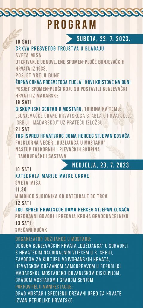 Program organizira Udruga Bunjevačkih Hrvata „Dužijanca“, u suradnji s Hrvatskim nacionalnim vijećem u Republici Srbiji, Zavodom za kulturu vojvođanskih Hrvata, Hrvatskom državnom samoupravom u R. Mađarskoj, Mostarsko-duvanjskom i Trebinjsko-mrkanskom biskupijom, Gradom Mostarom i Gradom Senjom.