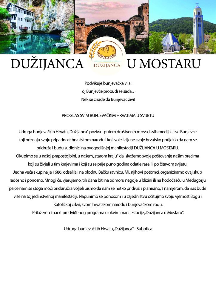 – Na Trgu hrvatskih velikana b. b. (Rondo) ispred Hrvatskoga doma „Herceg Stjepan Kosača“ bit će upriličena folklorna večer „Dužijanca u Mostaru“, nastup folklora, pjevačkih i tamburaških skupina