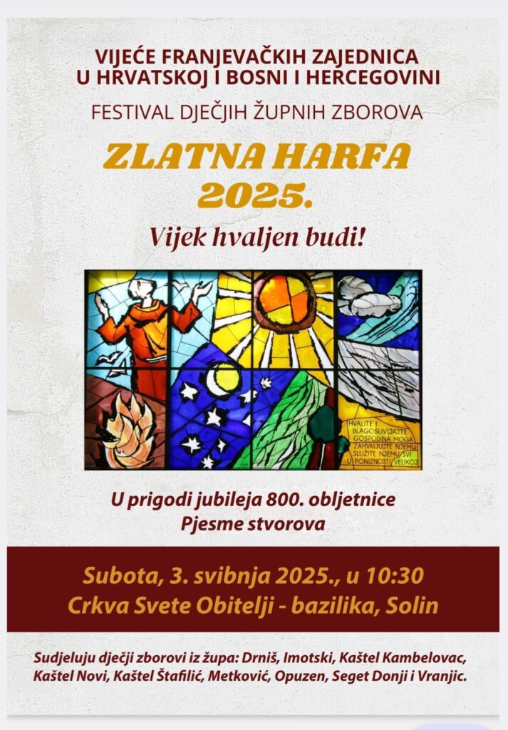 Vijeće franjevačkih zajednica u Hrvatskoj i Bosni i Hercegovini organizira Festival dječjih župnih zborova – Zlatnu harfu u subotu 3. svibnja u 10.30 u crkvi Svete Obitelji u Solinu. Nastupit će devet dječjih crkvenih zborova iz Splitsko-makarske nadbiskupije – odnosno oko 400 djece. Drugi dio Zlatne harfe bit će održan 31. svibnja na Udbini.