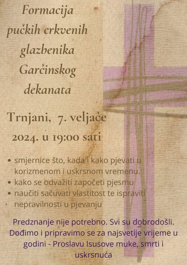 Formacija pučkih crkvenih glazbenika održat će se u Župi sv. Marka u Trnjanima u srijedu 7. veljače s početkom u 19 sati. Susret će voditi Luka Ćosić i Dino Klem. Taj, prvi u nizu, susret ima za cilj potaknuti unaprjeđenje crkvenog pjevanja i podići svijest o njegovoj važnosti u liturgiji. Za sudjelovanje na susretu nije potrebno nikakvo predznanje.