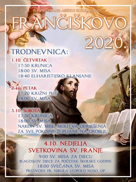 Frančiškovu slavi Župa Kukuljanovo. Trodnevna duhovna priprava počinje u četvrtak 1. listopada molitvom krunice u 17:30. Misa je na rasporedu u 18 sati, a zatim je u 18:40 klanjanje Presvetom Oltarskom Sakramentu.