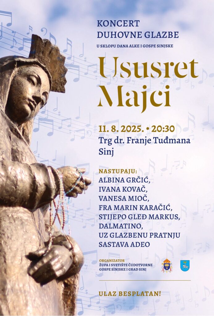 Uoči Dana Grada Sinja i svetkovine Velike Gospe, Grad Sinj i Bazilika Gospe Sinjske organiziraju duhovno-domoljubni koncert pod nazivom „Ususret Majci“ koji će se održati u ponedjeljak 11. kolovoza u 20.30 na Trgu dr. Franje Tuđmana.