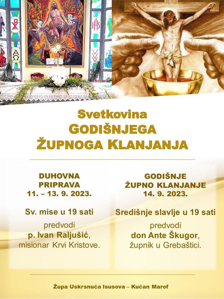 Župa Uskrsnuća Isusova u Kućan Marofu svoje godišnje župno klanjanje imat će na blagdan Uzvišenja sv. Križa u četvrtak 14. rujna. Na dan župnog klečanja, misa će biti prijepodne u 10 sati te večernja u 19 sati koju će predslaviti don Ante Škugor, župnik u Grebaštici kraj Šibenika.