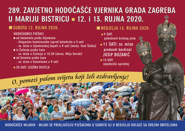 Marija Bistrica, (IKA) – Hodočašće mladih Zagrebačke nadbiskupije u Hrvatsko nacionalno svetište Majke Božje Bistričke u Mariji Bistrici, kao i 289. zavjetno hodočašće vjernika grada Zagreba, ove će se godine održati u subotu i nedjelju, 12. i 13. rujna, pod geslom: ,,O, pomozi palom svijetu koji želi ozdravljenje”.