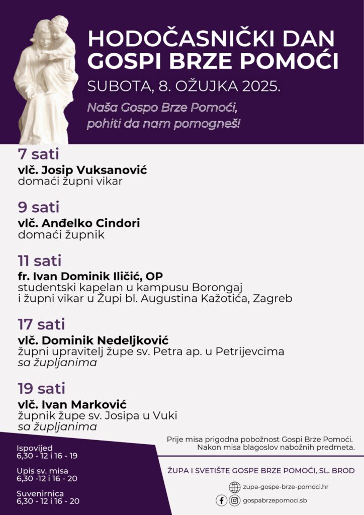 Hodočasnički dan Gospi Brze Pomoći „osmi“ u ožujku proslavlja se u subotu, 8. ožujka, u istoimenom Gospinu svetištu u Slavonskom Brodu. Misna slavlja su u 7, 9, 11, 17 i 19 sati.