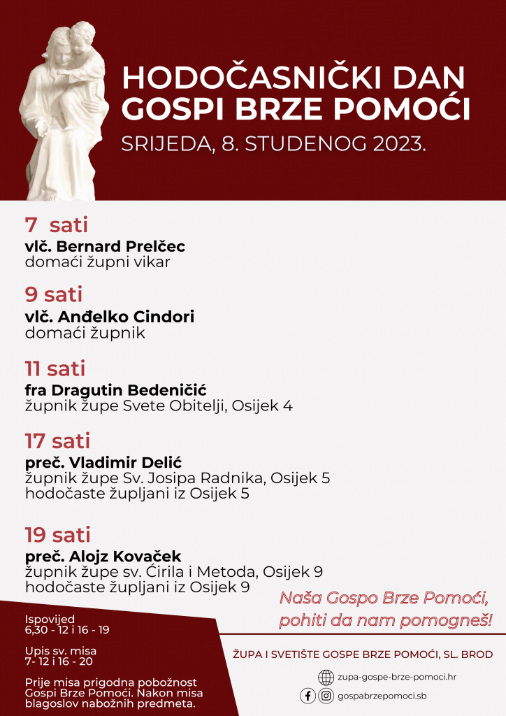 Hodočasnički dan Gospi Brze Pomoći, „osmi“ u studenom bit će proslavljen u srijedu 8. studenog u istoimenom Gospinu svetištu u Slavonskom Brodu.