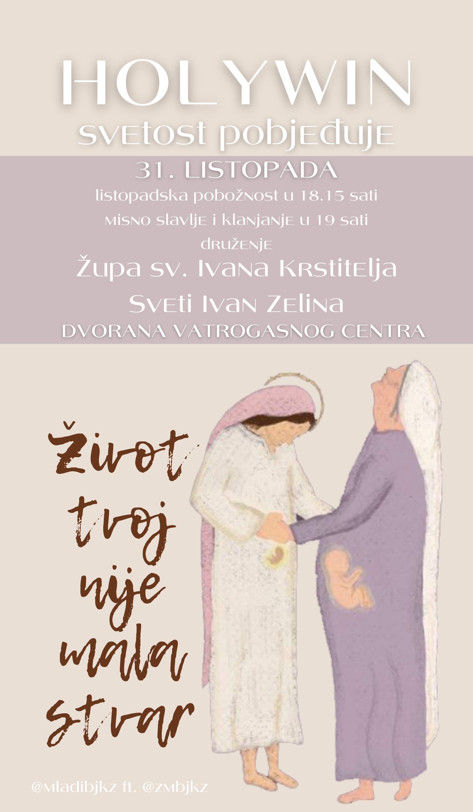 U organizaciji Pastorala mladih Bjelovarsko-križevačke biskupije održat će se bdjenje uoči svetkovine Svih Svetih – Holywin – svetost pobjeđuje, u utorak, 31. listopada 2023. pod geslom: “Život tvoj nije mala stvar”. Ovogodišnje biskupijsko bdjenje održava se u Župi svetog Ivana Krstitelja u Zelini, u dvorani Vatrogasnog centra (Bocakova ulica 11, 10380 Sv. Ivan Zelina). Program bdjenja započet će u 18.15 listopadskom pobožnošću nakon koje će uslijediti misno slavlje u 19 sati, te klanjanje i druženje.