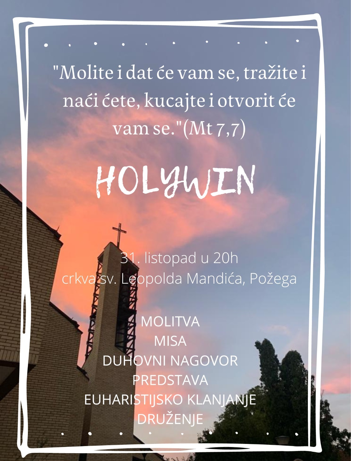 Župa sv. Leopolda Mandića i Križarsko društvo bl. Alojzija Stepinca organiziraju Holywin, bdjenje uoči svetkovine Svih Svetih, koje će se održati u ponedjeljak 31. listopada u župnoj crkvi s početkom u 20 sati.