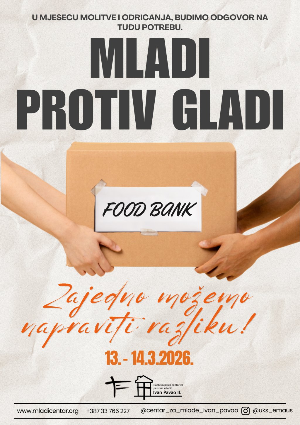 Nadbiskupijski centar za pastoral mladih „Ivan Pavao II.“, u suradnji s katoličkom udrugom „Emaus“, organizira 13. i 14. ožujka humanitarnu akciju „Mladi protiv gladi“ čiji je cilj smanjenje gladi među najranjivijim skupinama bosanskohercegovačkog društva.