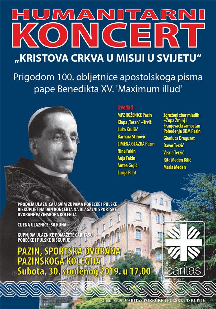 Humanitarni koncert Caritasa Porečke i Pulske biskupije održat će se u Pazinu, u sportskoj dvorani Pazinskog kolegija, u subotu 30. studenoga u 17 sati.