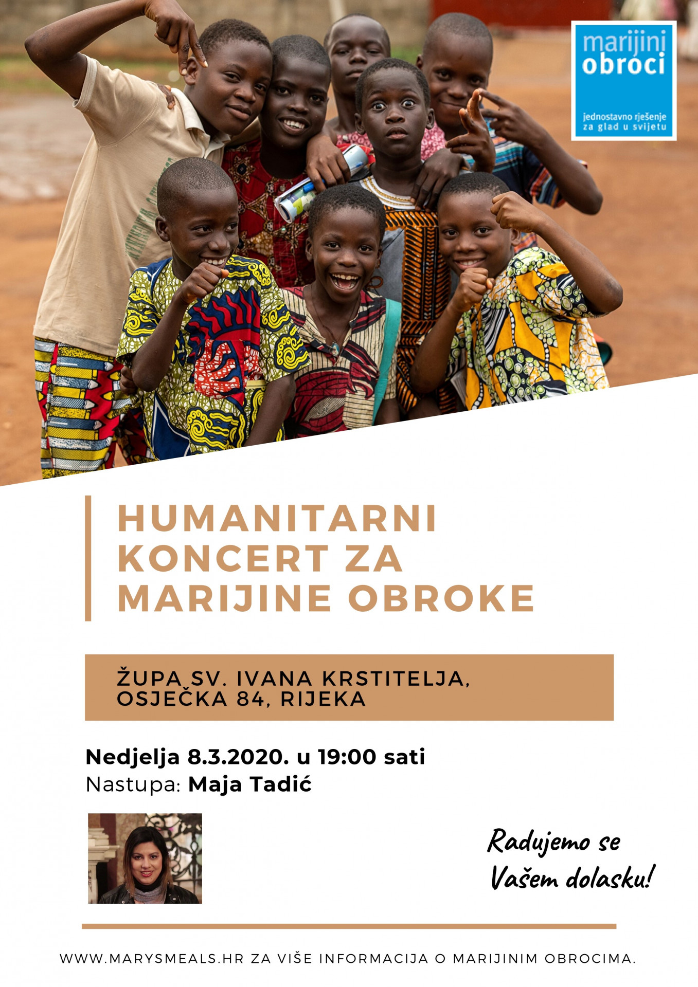 Riječki volonteri “Marijinih obroka”, humanitarne organizacije koja djeci u najsiromašnijim zajednicama svijeta osigurava svakodnevno topli obrok u mjestu obrazovanja, u nedjelju 8. ožujka organiziraju prvi humanitarni koncert u Rijeci koji će se održati u Župi sv. Ivana Krstitelja (Škurinje) s početkom u 19 sati.