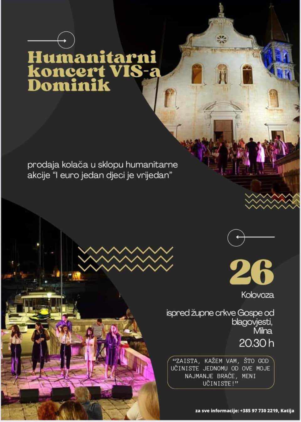 Vokalno–instrumentalni sastav Dominik iz Župe svetoga Dominika u Splitu održat će u subotu 26. kolovoza humanitarni koncert u Župi Gospe od Blagovijesti u Milni na Braču. Na koncertu koji će se održati pod motom „I euro jedan djeci je vrijedan” prikupljat će se sredstva za Udrugu roditelja djece s teškoćama u razvoju „Brački pupoljci”.