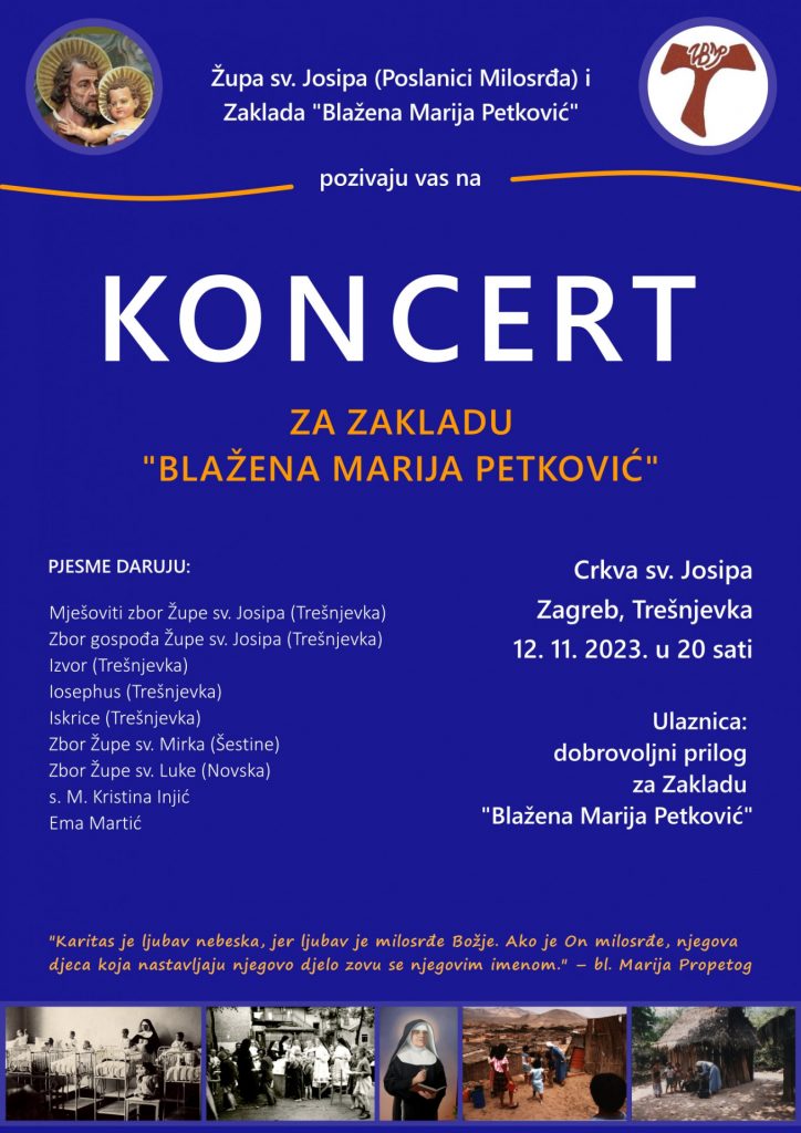 Humanitarni koncert „Za zakladu ‚Blažena Marija Petković‘“ održat će se u sklopu Dana Milosrđa u nedjelju, 12. studenog 2023. u Župi sv. Josipa u Zagrebu (Trešnjevka) s početkom u 20 sati.