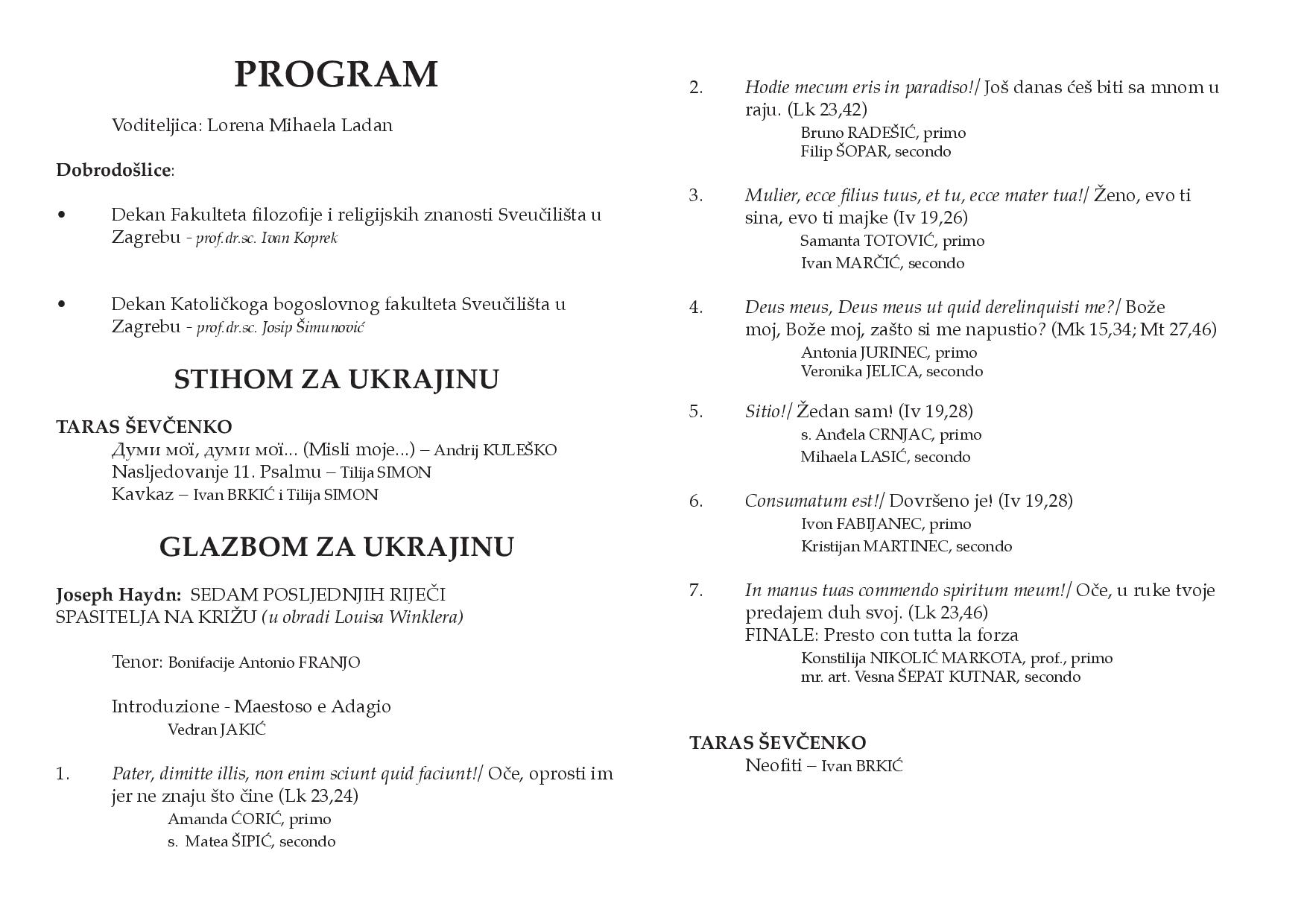 Institut za crkvenu glazbu Katoličkoga bogoslovnog fakulteta Sveučilišta u Zagrebu i Fakultet filozofije i religijskih znanosti Sveučilišta u Zagrebu u utorak 12. travnja u dvorani Antun Bauer na  Jordanovcu 110, s početkom u 19.30 sati organiziraju humanitarno-molitveni program Glazbom i stihom za Ukrajinu.