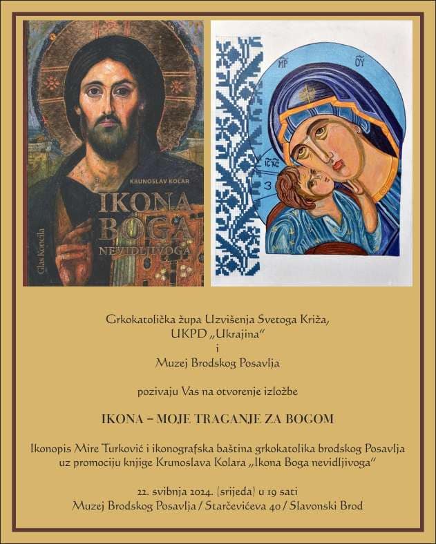 Slavonski Brod, (IKA) – Otvorenje izložbe „Ikona – moje traganje za Bogom – Ikonopis Mire Turković i ikonografska baština brodskog Posavlja“ uz promociju knjige svećenika Krunoslava Kolara „Ikona Boga nevidljivoga“ bit će u srijedu, 22. svibnja u 19 sati, u Muzeju Brodskog Posavlja u Slavonskom Brodu. Događaj organiziraju: Grkokatolička župa Uzvišenja Svetoga Križa – Slavonski Brod, UKPD „Ukrajina“ i Muzej Brodskog Posavlja.