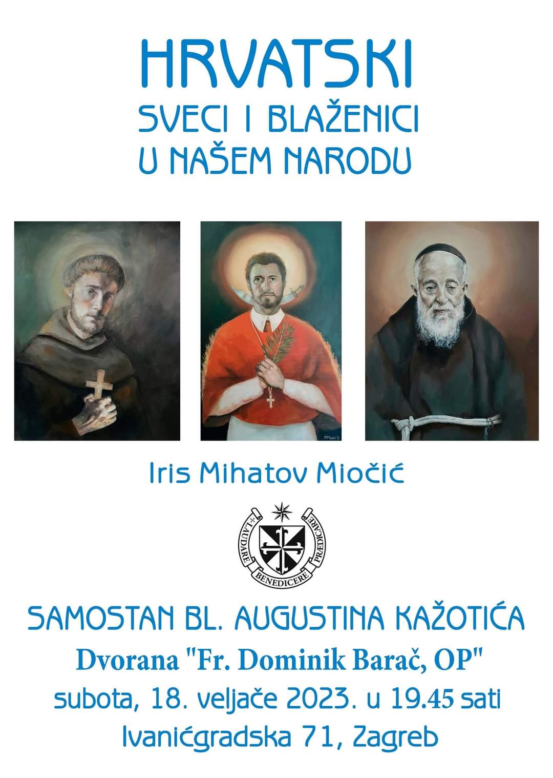Na blagdan zaštitnika umjetnika dominikanca bl. Ivana Fiesolea (fra Angelica) u subotu 18. veljače, u župnom i samostanskom kompleksu bl. Augustina Kažotića na zagrebačkoj Peščenici bit će otvorena izložba “Hrvatski sveci i blaženici u našem narodu” zadarske akademske slikarice Iris Mihatov Miočić. Otvorenje će biti nakon nakon mise u 19:45. Uz umjetnicu i oce dominikance, u ime organizatora sudjelovat će rektor Hrvatskoga nacionalnog svetišta sv. Josipa u Karlovcu mons. Antun Sente, predsjednica Udruge za promicanje znamenitih Križevčana “Dr. Stjepan Kranjčić” Tanja Baran i likovni kritičar Stanko Špoljarić.