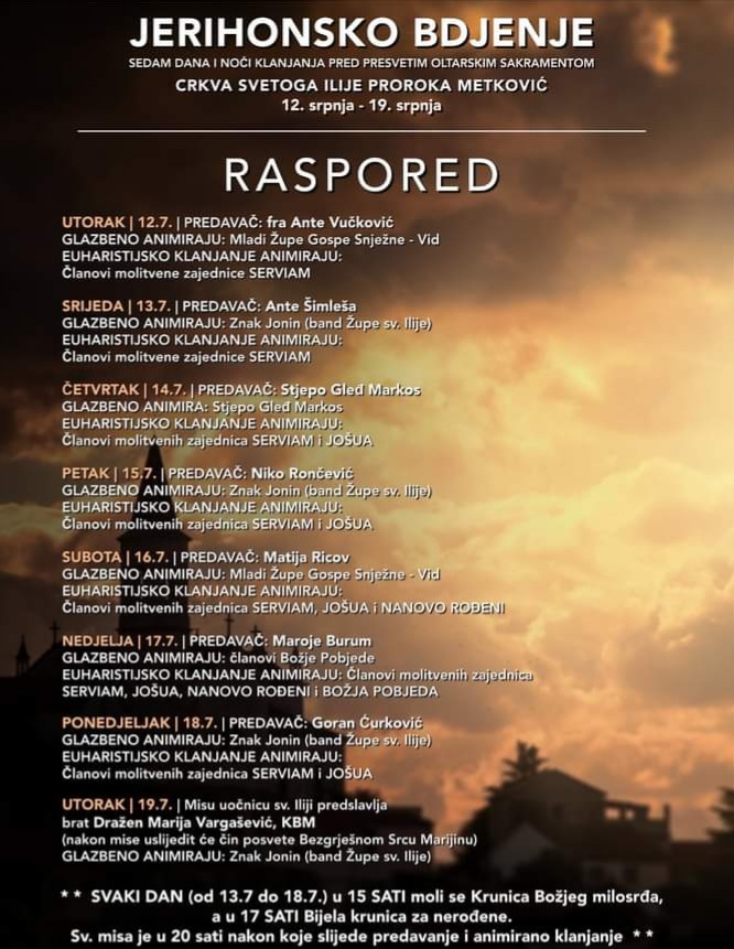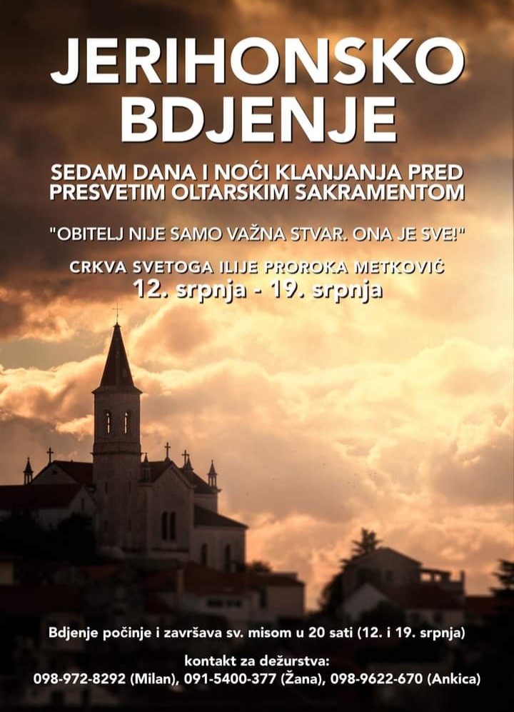 Jerihonsko bdjenje, sedam dana i noći klanjanja pred Presvetim Oltarskim Sakramentom, na temu “Obitelj nije samo važna stvar, ona je sve!” održat će se u crkvi Svetog Ilije Proroka u Metkoviću od 12. do 19. srpnja. Bdjenje počinje i završava misom u 20 sati (12. i 19. srpnja).
