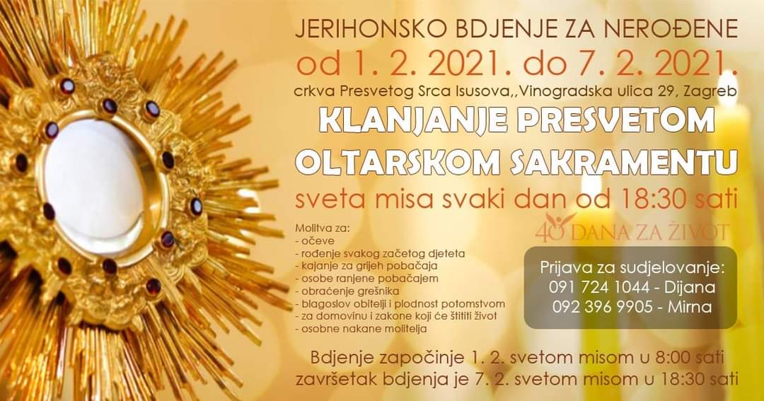 Jerihonsko bdjenje za nerođene održat će se od 1. do 7. veljače u crkvi Prevetoga Srca Isusova u sklopu bolnice Sestre milosrdnice u Vinogradskoj u Zagrebu.
