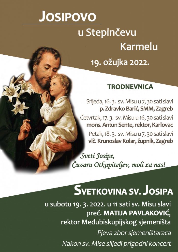 Brezovica, (IKA) – Svetkovina sv. Josipa svečano će biti proslavljena u subotu 19. ožujka u Karmelu Brezovici misnim slavljem koje će u 11 sati predvoditi rektor Međubiskupijskog sjemeništa preč. Matija Pavlaković. Pjevat će zbor sjemeništaraca. Nakon mise održat će koncert.