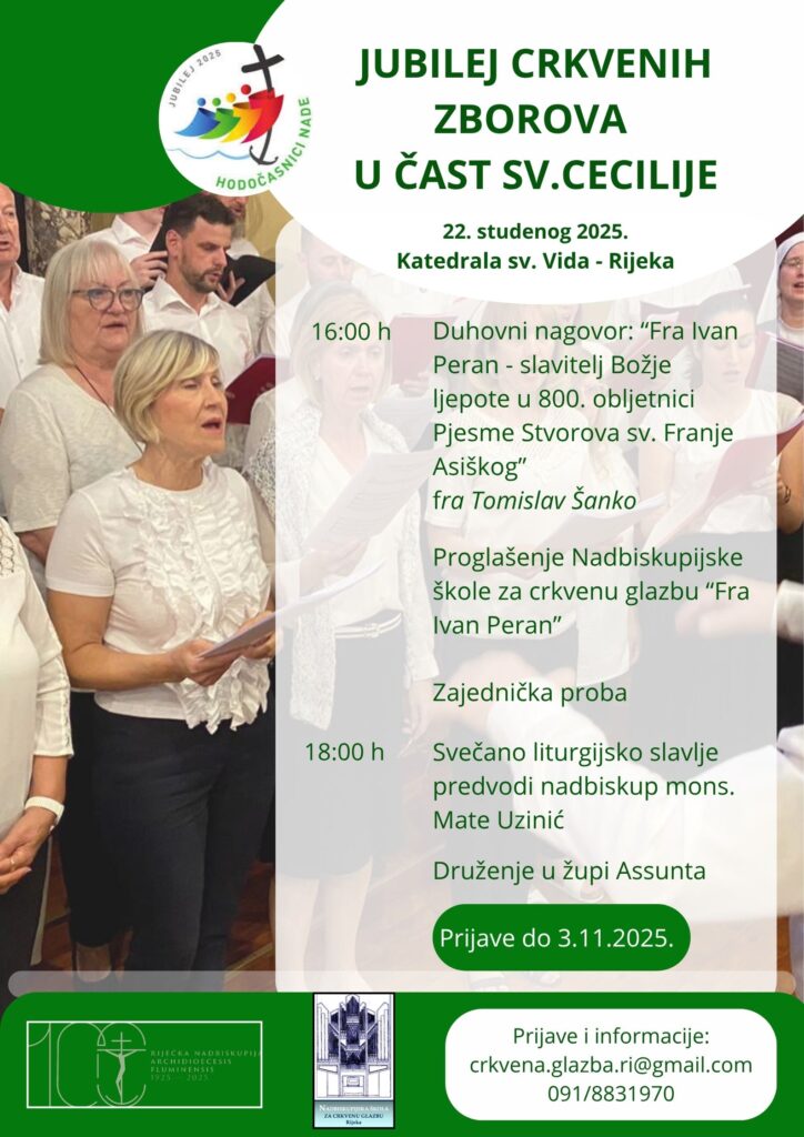 Na blagdan svete Cecilije, zaštitnice crkvenih glazbenika, u subotu 22. studenoga, u riječkoj katedrali sv. Vida s početkom u 16 sati održat će se Jubilej crkvenih zborova i pjevača, u organizaciji Nadbiskupijske škole za crkvenu glazbu. Susret, koji okuplja crkvene glazbenike iz cijele Riječke nadbiskupije, bit ćr ujedno prigoda za svečano imenovanje škole imenom „Fra Ivan Peran“.