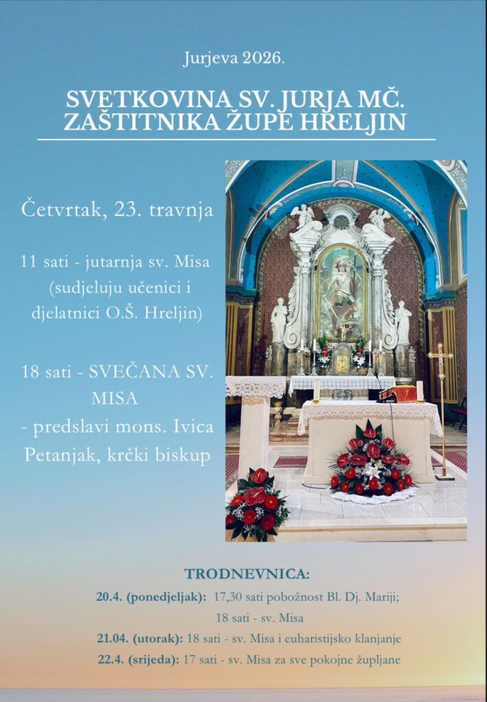 Župa sv. Jurja mč. na Hreljinu slavi nebeskog zaštitnika sv. Jurja mč. u četvrtak 23. travnja. Svečanu misu u 18 sati predslavi krčki biskup Ivica Petanjak u zajedništvu svećenika Bakarskog dekanata.