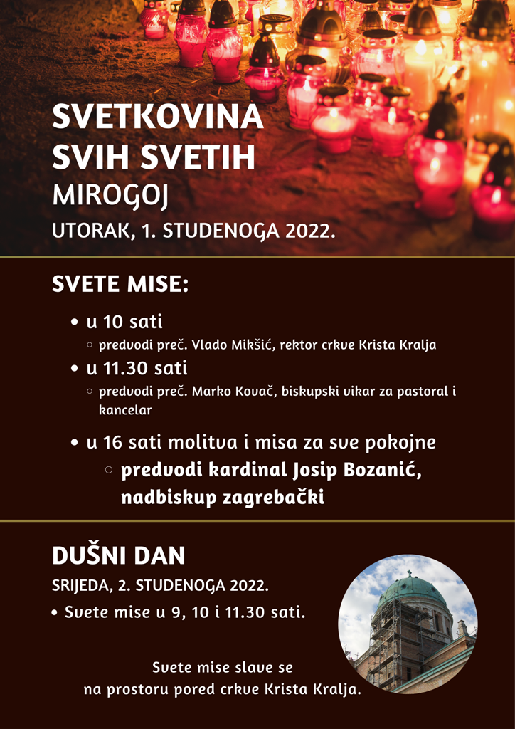 Zagreb, (IKA) – Na svetkovinu Svih svetih u utorak 1. studenoga 2022. mise na groblju Mirogoj bit će u 10, 11.30 i 16 sati.